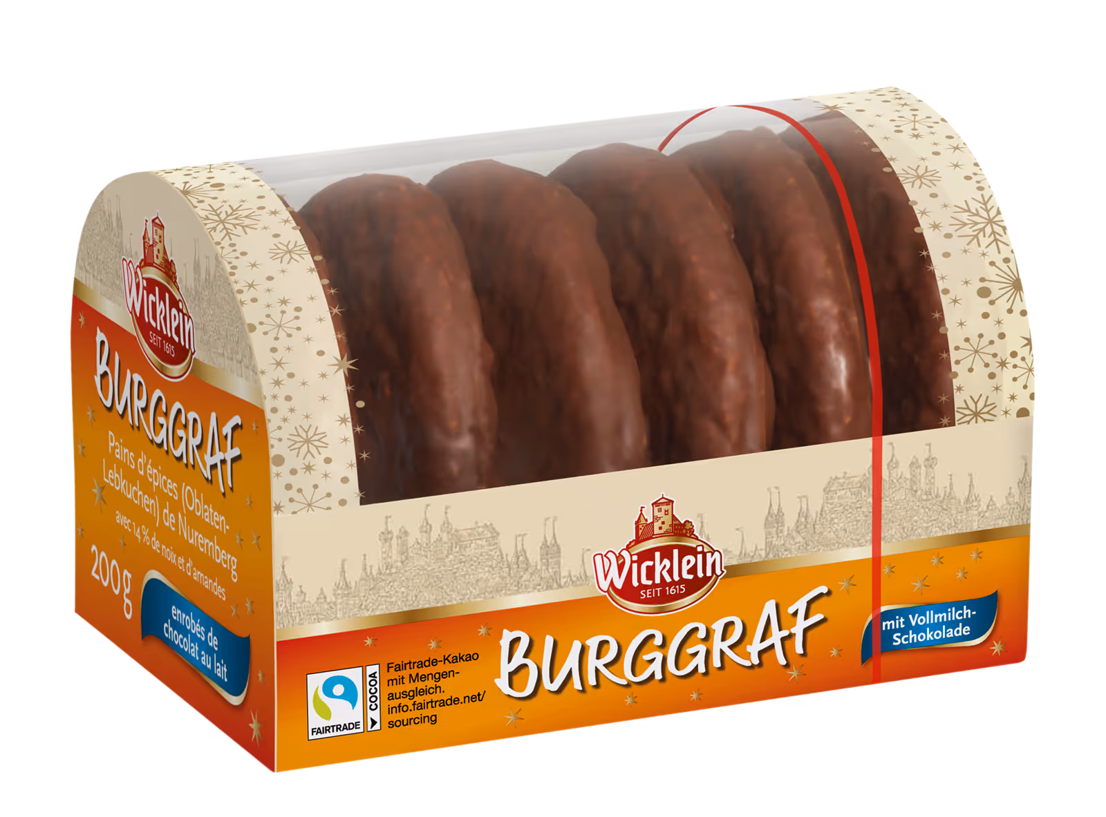 Mit zwölf Prozent Nüssen und Ölsamen sowie einem fruchtigen Kern aus Persipan der perfekte Lebkuchen für den süßen Genuss zwischendurch. Die saftigen Oblaten-Lebkuchen mit heller Vollmilchschokolade sind die neueste Kreation in unserer beliebten Burggraf-Linie.