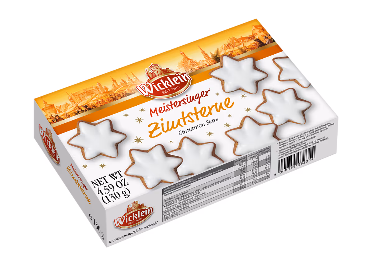 Unsere klassischen Zimtsterne nach traditioneller Rezeptur enthalten 40 Prozent Nüsse und Kerne und sind dadurch besonders saftig. Mit feinem Zuckerüberzug und einem Hauch Zitronenschalen dürfen sie in der Vorweihnachtszeit auf keinem Gebäckteller fehlen.